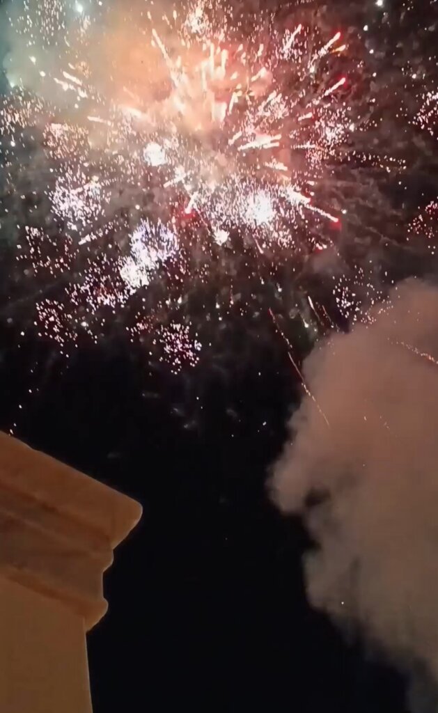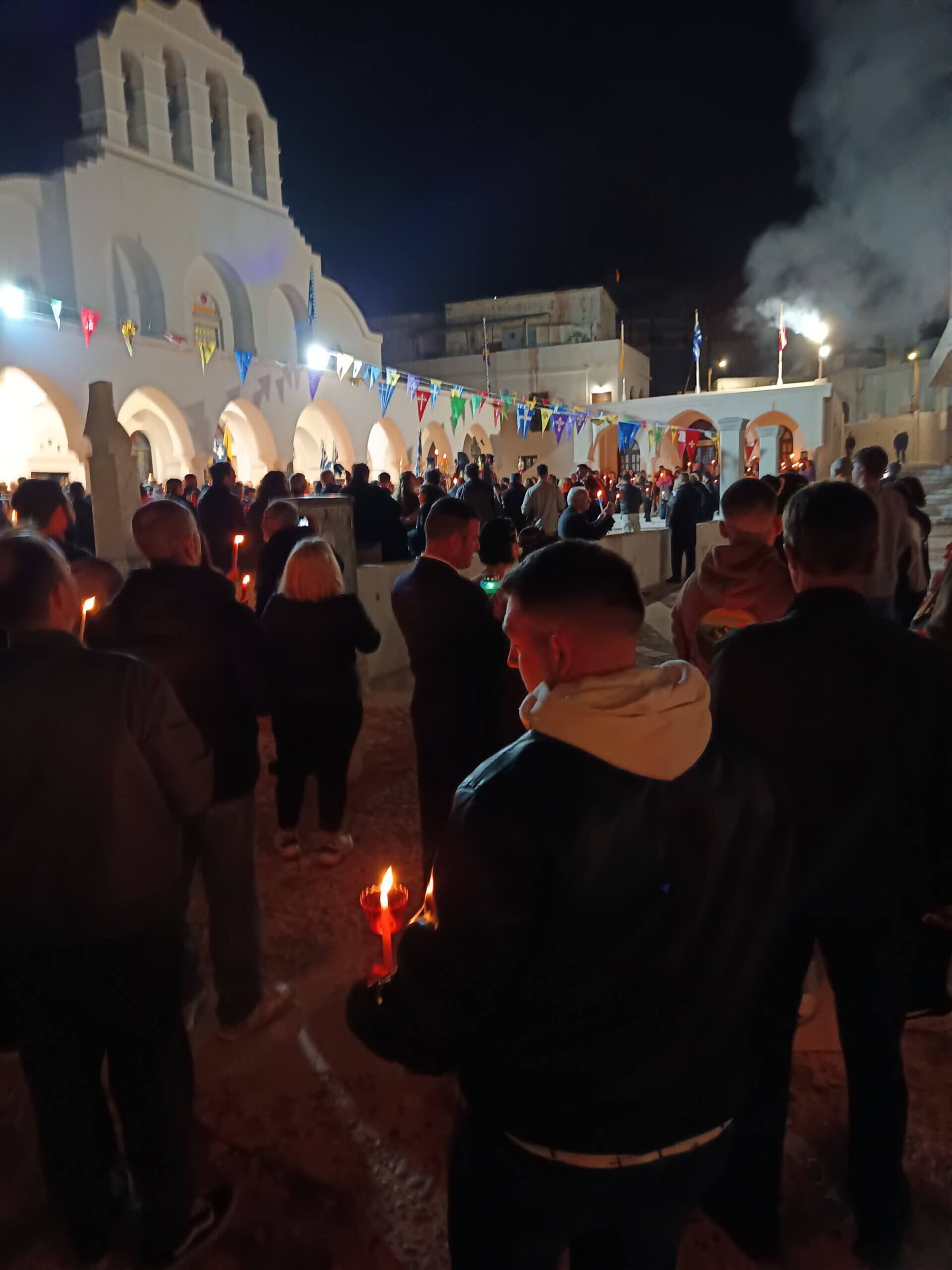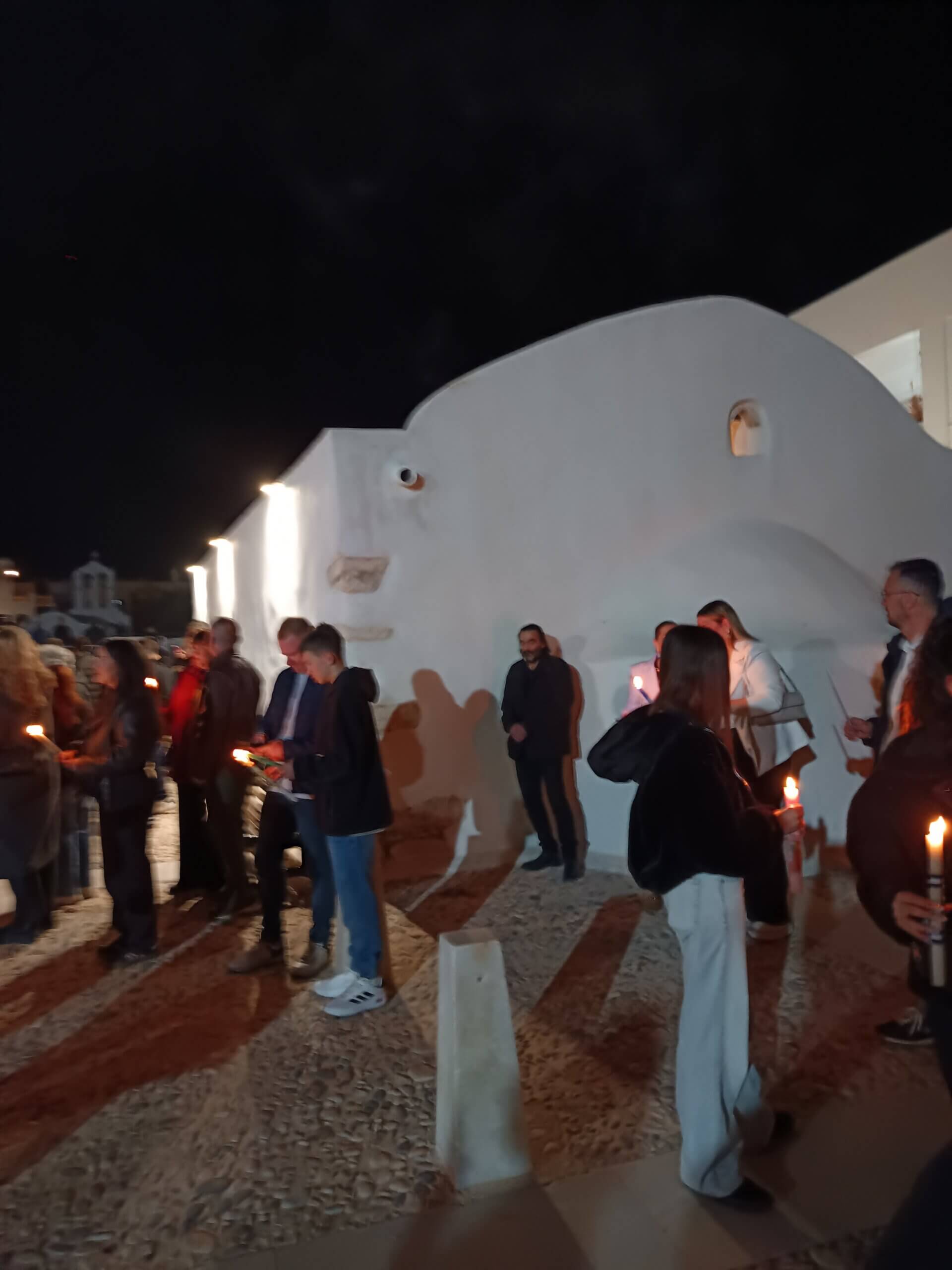 Le samedi soir, quant à lui, est consacré à l’attente de la Résurrection qui est célébrée à minuit. On nous parle de cérémonie des lumières et de feux d’artifice… Allons voir cela de plus près ! Direction l’église du Métropolite, vers le port de Naxos. Nous ne sommes pas seuls, et « équipés » de notre bougie encore éteinte, nous attendons minuit. La lumière se distribue alors de bougie en bougie entre tous les participants, le feu d’artifice retentit et les sourires s’affichent partout.
